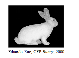Leia o texto a seguir.Em 2000, o artista Eduardo Kac, carioca radicado nos Estados Unidos, criou GFP Bunny, um coelho geneticamente modificado que brilha em presença de luz azul graças à Proteína Fluorescente (GFP) inserida em seu DNA.