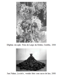 Acesso em: 10 abr. 2015.)Segundo o texto, as cidades convivem ao mesmo tempo com a ordem e o caos, com a pobreza e a riqueza, com a beleza e a feiura. Esses aspectos da vida urbana são evidenciados em muitas manifestações artísticas. Efigênia Rolim produz e traveste-se com roupas e acessórios feitos de papéis de bala, e de restos de outros materiais; declama poemas e histórias criados por ela, em espaços públicos, o que resulta em um ato performativo que chama a atenção para os problemas ecológicos. Jum Nakao confeccionou um vestido, Luxdelix, com sacos de lixo para um ensaio fotográfico em um lixão a céu aberto no Rio de Janeiro.