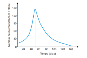 Uma população de microcrustáceos (Daphnia sp.) foi mantida em tubo de ensaio com nutrientes e condições ideais de temperatura e pH da água. Durante 140 dias, o crescimento dessa população foi quantificado, e os dados obtidos foram inseridos no gráfico.
